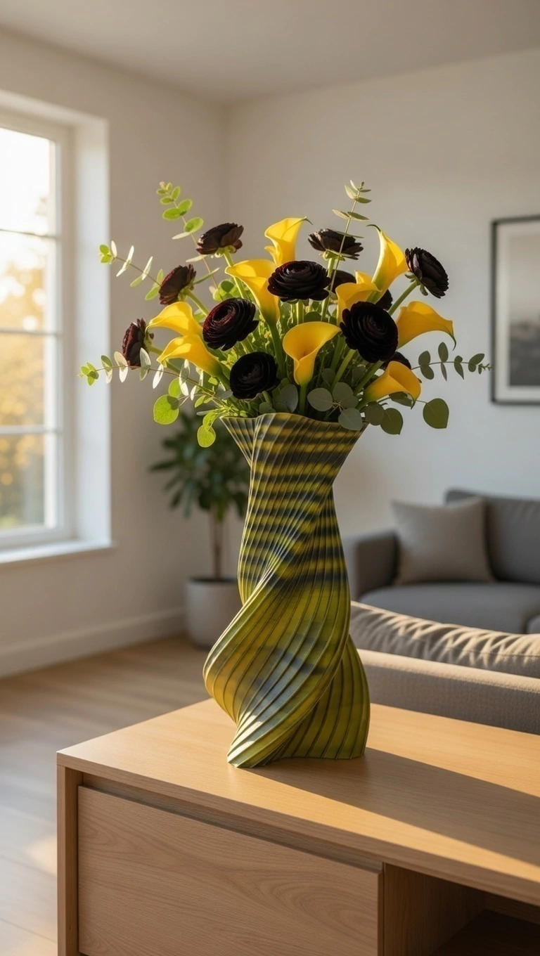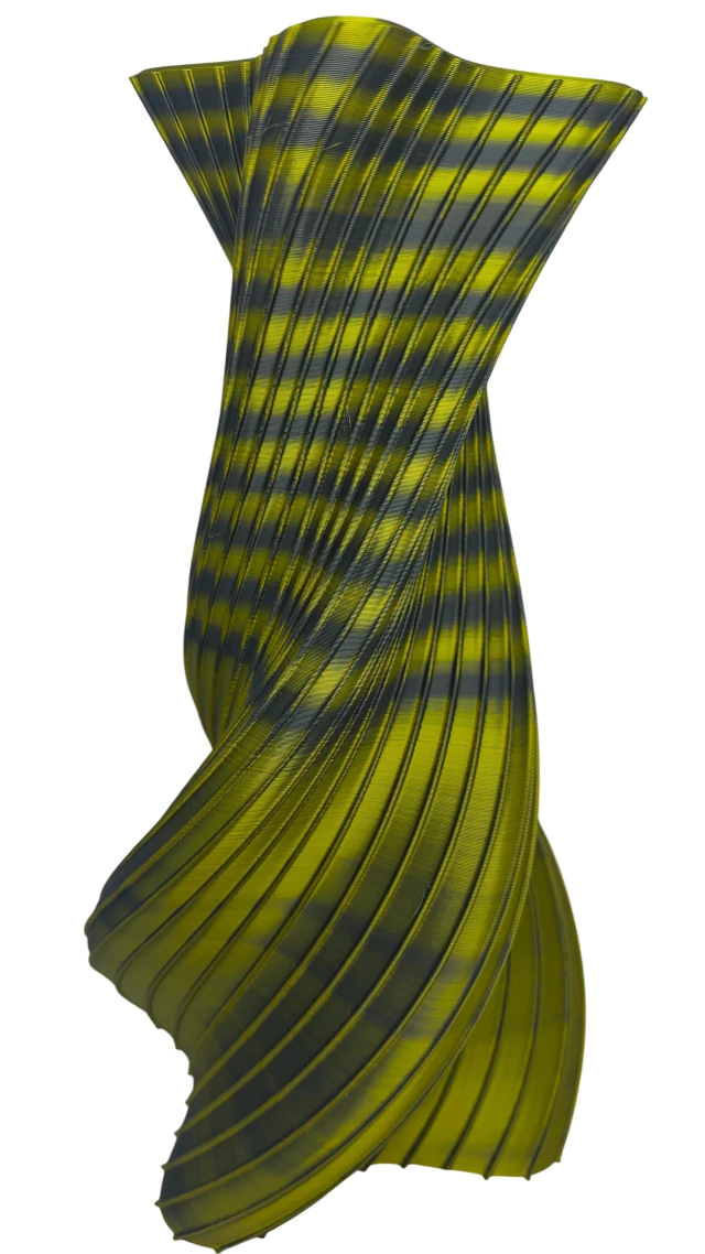 Não é apenas um vaso, é uma escultura gerada por algoritmos e materializada pela tecnologia. O Vaso Vórtice Solar traz uma dinâmica visual única: dependendo do ângulo e da luz, as sombras dançam pelas suas ranhuras, revelando um contraste vibrante entre o amarelo neon e o preto profundo.
